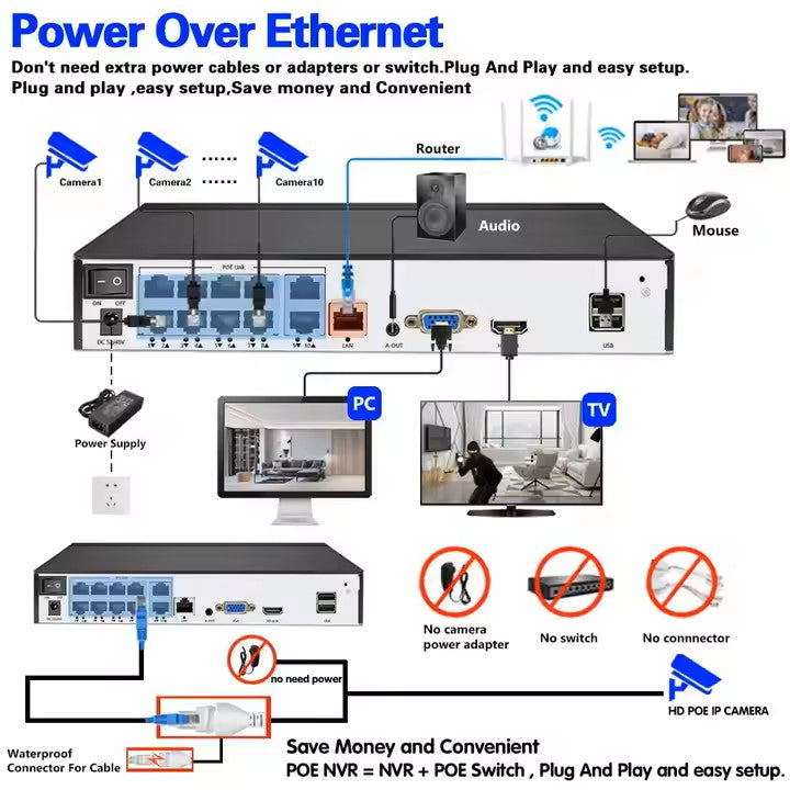 Secure your property with this 8MP 4K Ultra HD PoE CCTV camera system. Compatible with Hikvision protocol, this 8-channel kit includes weatherproof dome cameras with built-in audio, night vision, and a reliable NVR for seamless recording and remote viewing. Perfect for outdoor or indoor use.